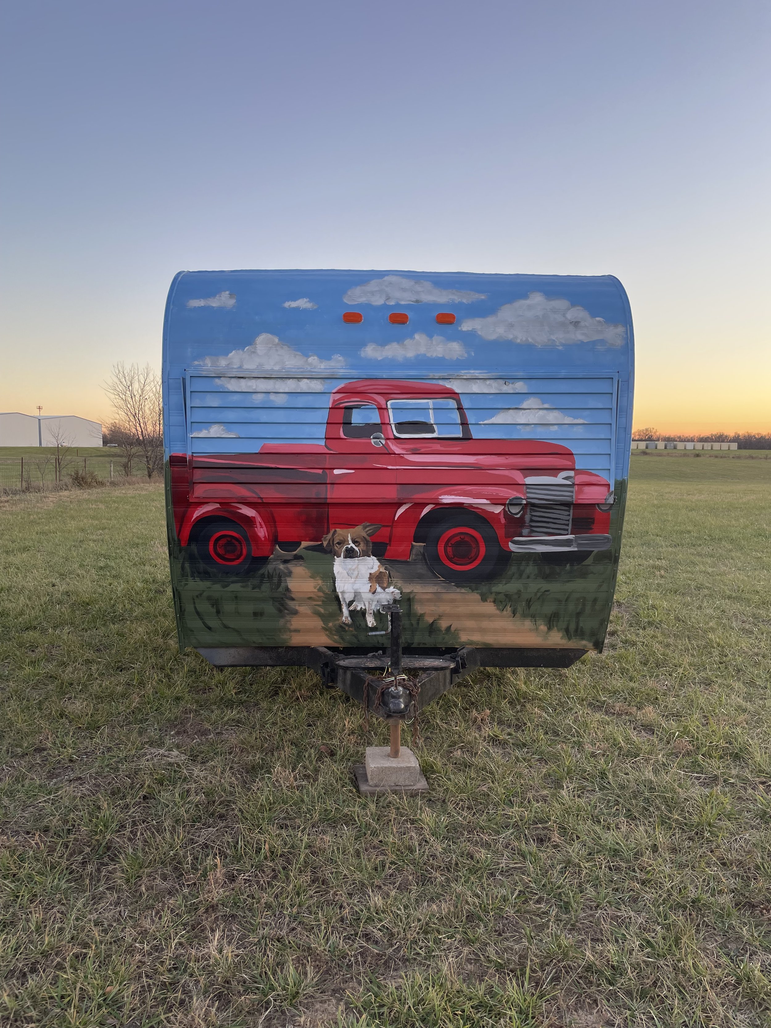 There is not an inch of this camper untouched by the brush! More than 20 animals, a truck, bike, chicken coop and more fill the sides of it to make a beautiful barnyard scene that one would love to walk right into. Try to keep your eyes on the road when this camper passes by, and contact me when you’re ready to impress the camp grounds yourself.